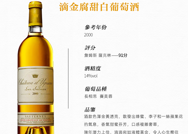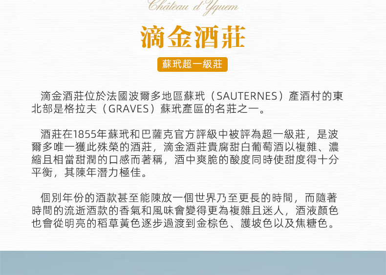 滴金酒莊(Chateau d'Yquem)蘇岱超壹級莊 滴金酒莊 伊甘古堡貴腐甜型 葡萄酒甜白 呂薩呂斯堡 1996滴金台灣同城配送
